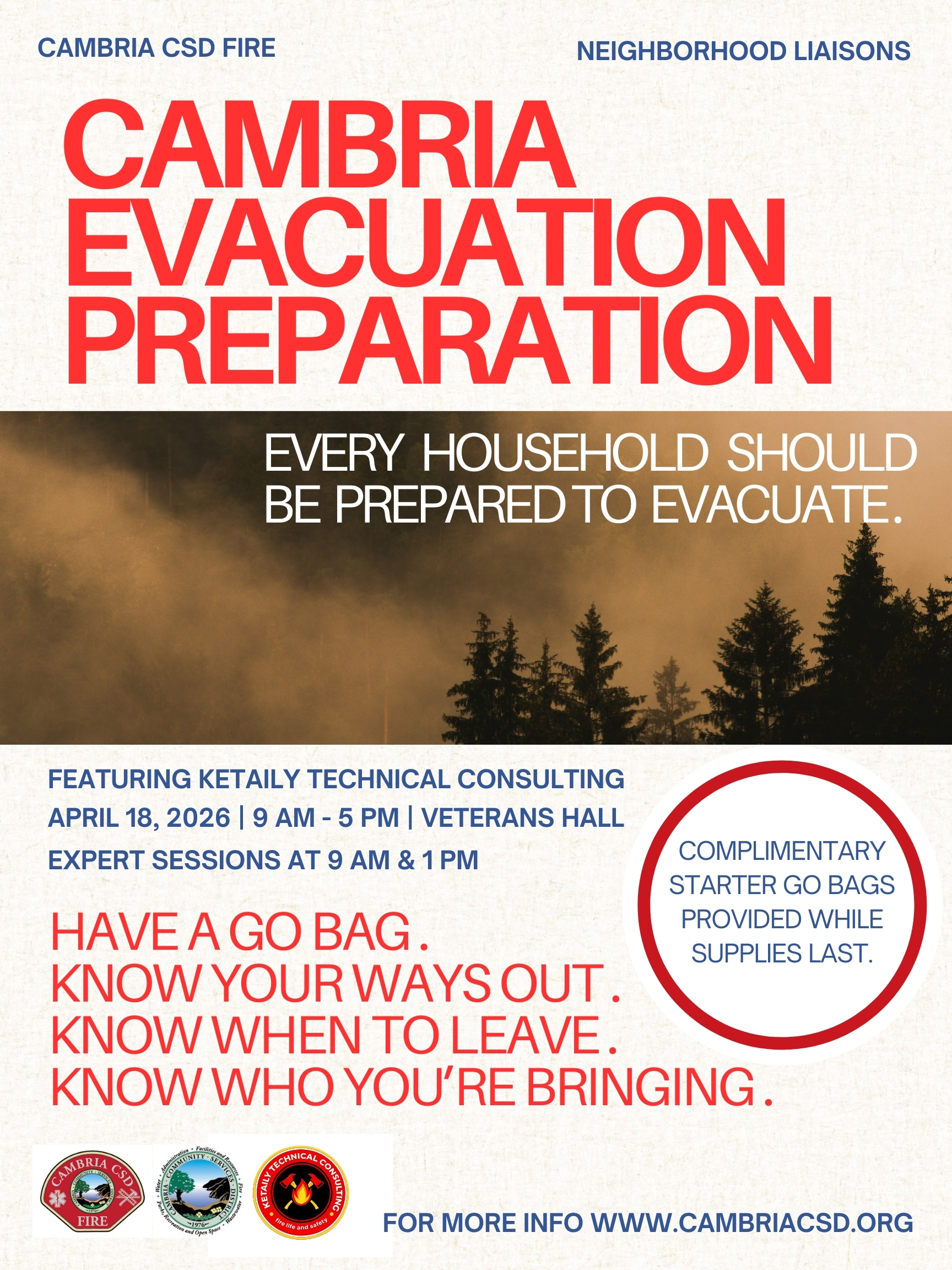 Join Cambria Fire, the Cambria CSD Neighborhood Liaisons, and Ketaily Technical Consulting to learn how to build a Go Bag, plan evacuation routes, and prepare your family.